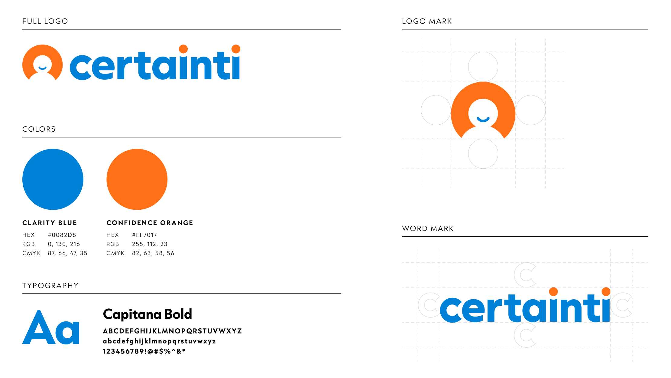 The identity balances intelligence with warmth. A confident circular mark suggests conversation, connection, and certainty, supported by a bright blue and orange palette and a clean typographic system designed for clarity across digital platforms. The system was built to feel human, modern, and highly scalable across industries.